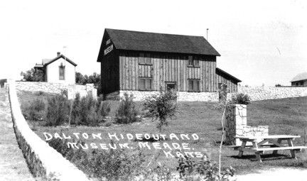 The Dalton Gang Hideout as a tourist attraction found its beginnings in 1940. Walter and Ruth Dingess were operating a cafe in Englewood, Kansas, and looking for a place to open a museum to house their growing collection of artifacts. Walter was, in fact, checking with the Big Well in Greensburg the day Joe Ross and J.W. Cooper went to his cafe to approach him with the idea of coming to Meade. The two left word for the Dingess to come to a Chamber of Commerce meeting and present their ideas, which they did--the rest is history.\
