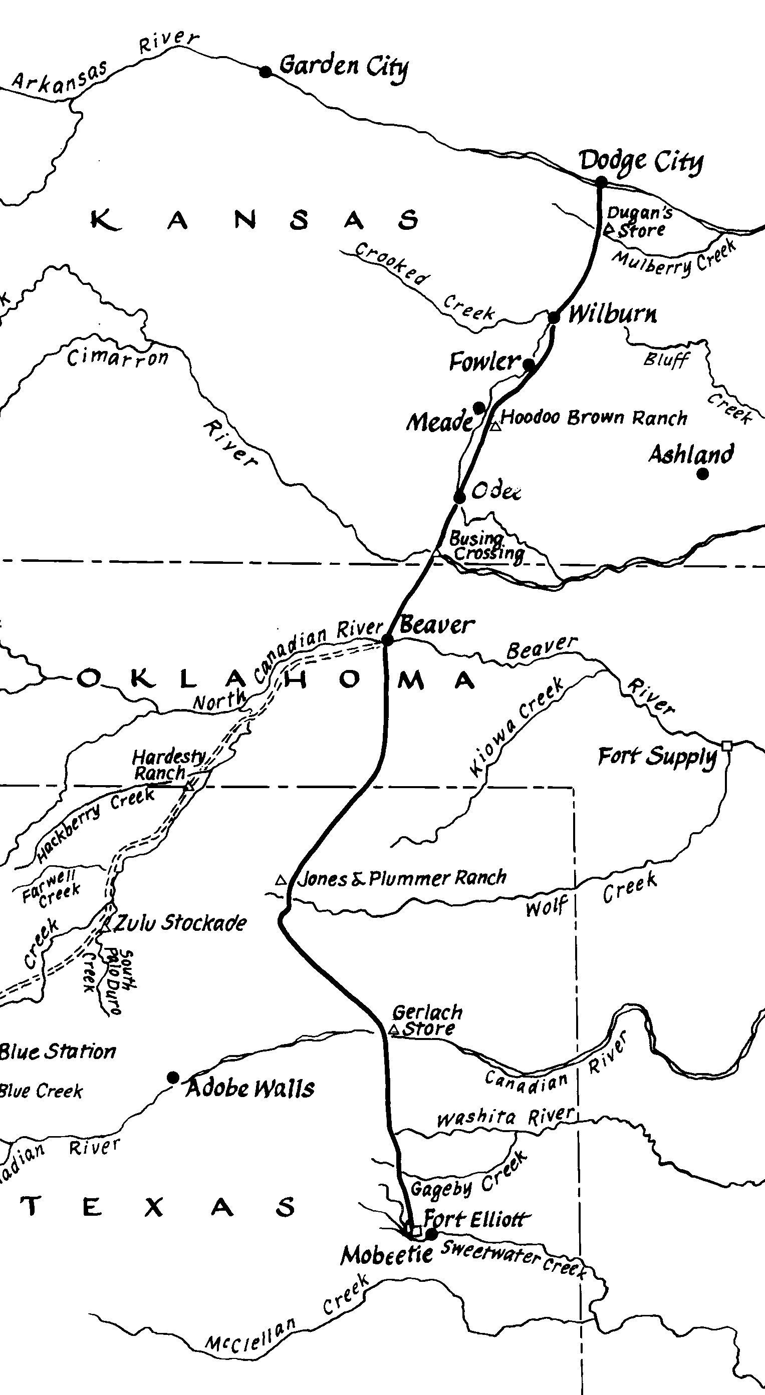At midpoint in the trail's history, say about 1879, a traveler journeying to the Jones and Plummer front door from Dodge City would cover some one hundred sixty eight miles, would cross six flowing streams and rivers, would observe at least four different textures of dust settling on his boots, and would wonder for hours whether he were the only traveler on the plains. If he had loaded his wagon with general merchandise at Wright, Beverly & Co. on Front Street he would start the trip by making a sharp turn down Bridge Street, heading south out of town. He would have experienced his first annoyance at having to pay the tollkeeper two dollars to take his six- or even four-team hookup across the wooden bridge; still, it was worth the price to make an easy crossing. The road out of town was flanked by cowboy camps, and the wheels of the wagon at first would have turned up fine sand as the sand hills rolled gently for a few miles and then gave over to the short grass and dark soil of the High Plains.